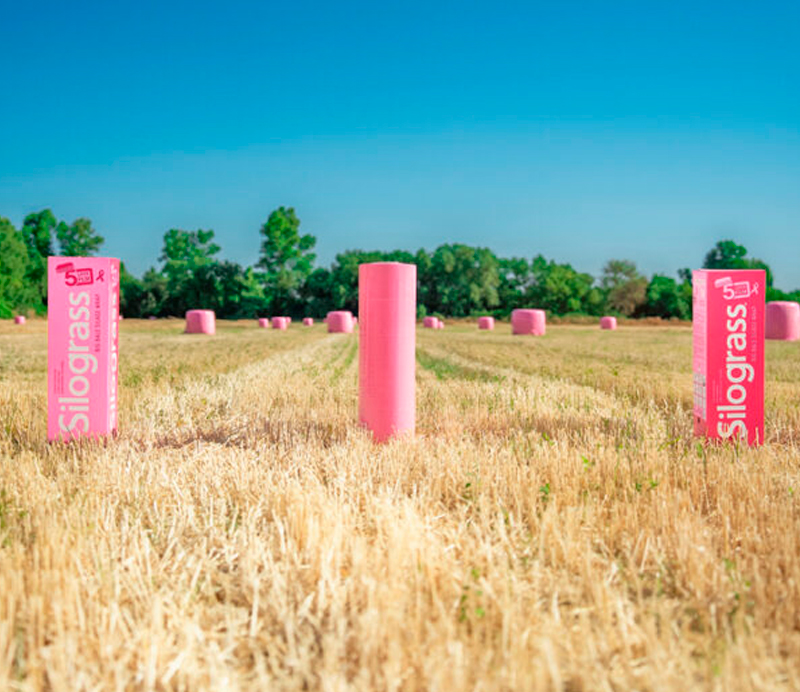 Cuando el campo cambia de color, el mensaje se ve desde lejos. Cada paca encintada en rosa, azul o amarillo convierte una tarea técnica en un gesto de apoyo real a la investigación contra el cáncer de mama.